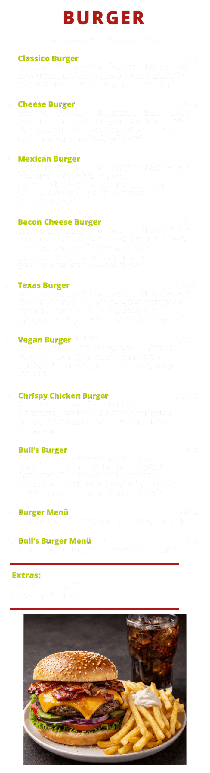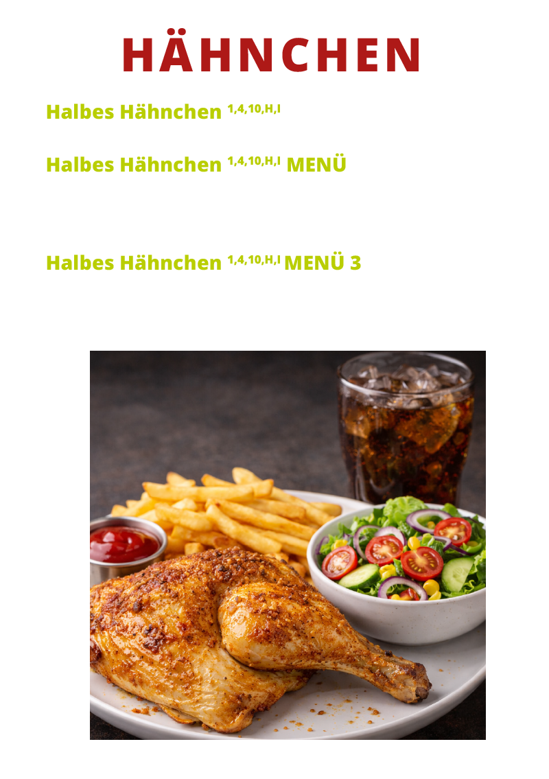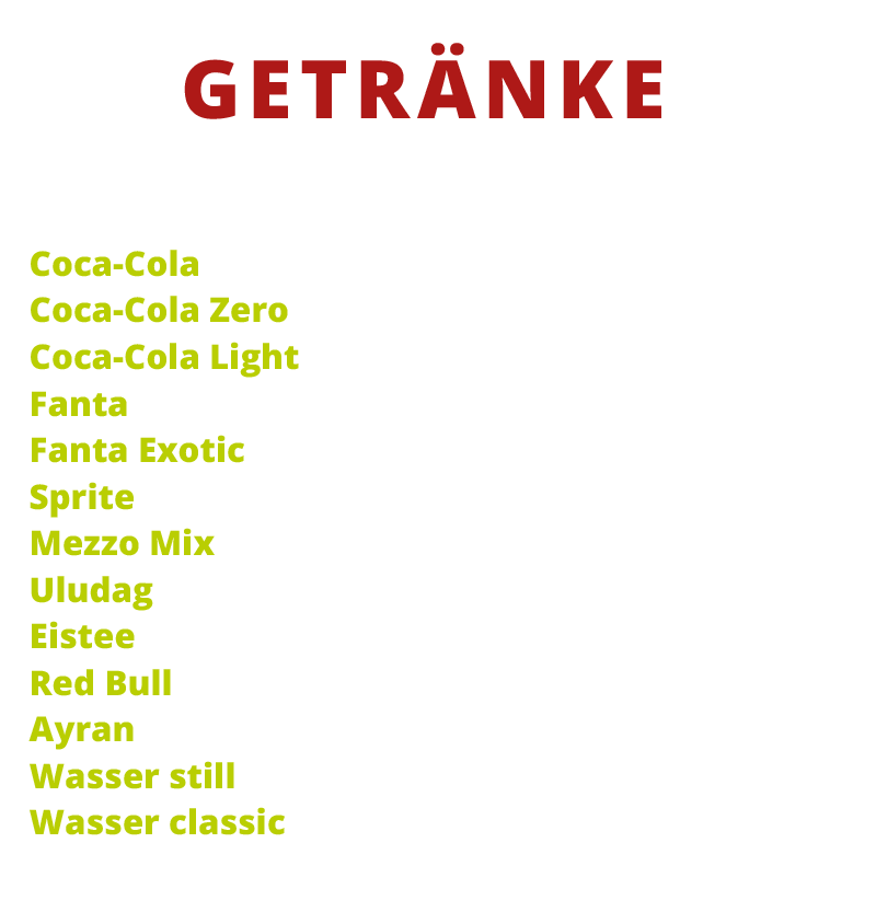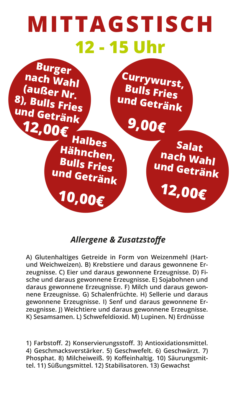 Burger Hähnchen Bratwurst & Co. Salate Pommes & Fingerfood Getränke Eisspezialitäten Mittagstisch Hamburger Toggle Menu Impressum Datenschutz Hamburger Toggle Menu