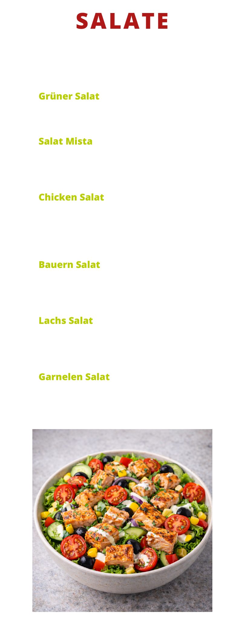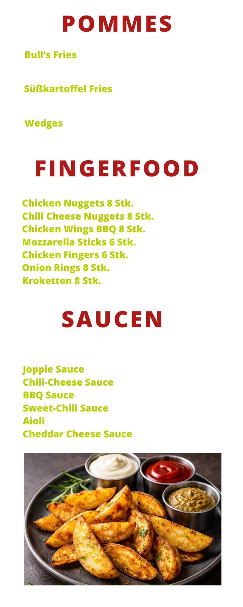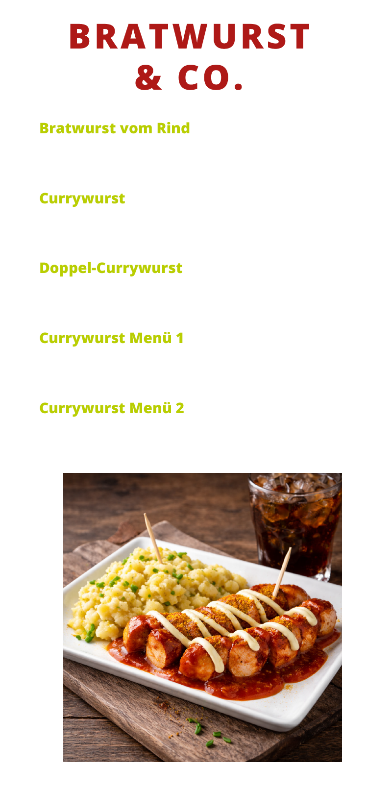 Burger Hähnchen Bratwurst & Co. Salate Pommes & Fingerfood Getränke Eisspezialitäten Mittagstisch Hamburger Toggle Menu Impressum Datenschutz Hamburger Toggle Menu